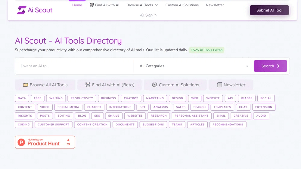 A Al Scout, assim como a plataforma anterior, também é um banco de ferramentas que oferece serviços de consultoria e desenvolvimento de tecnologias de IA para as empresas.