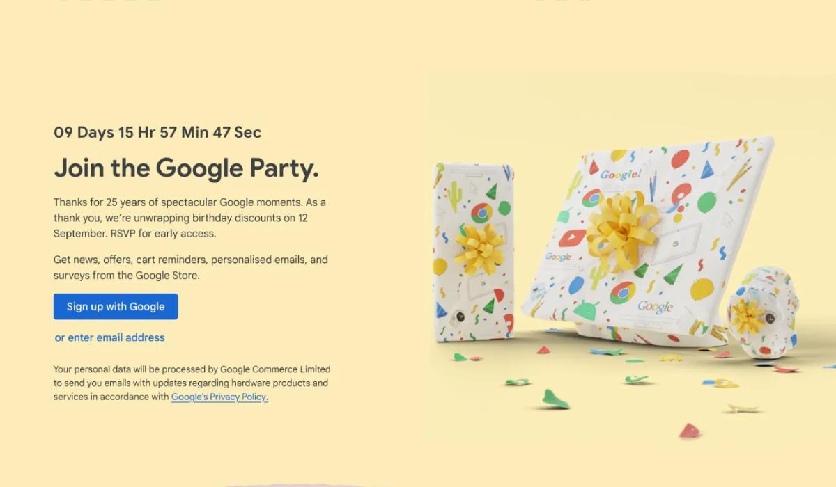 A promoção, intitulada “Join the Google Party”, vai estar disponível em diversos países europeus, incluindo o Reino Unido, Irlanda, França, Alemanha, Itália, Espanha, Dinamarca, Países Baixos, Noruega e Suécia. A empresa agradece aos utilizadores pelos “25 anos de momentos espetaculares da Google” e promete descontos em produtos selecionados.