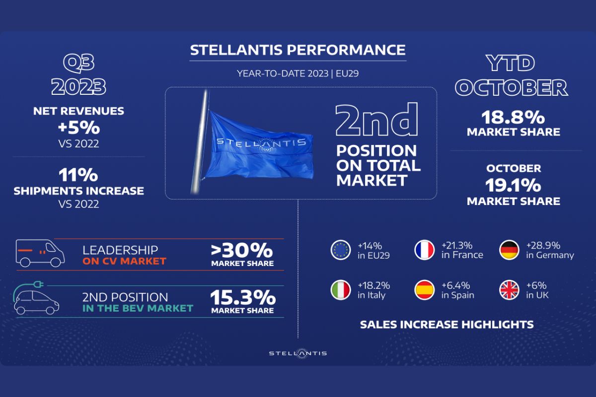 A Stellantis é líder do mercado total em França, Itália e Portugal (25,9% de quota), detendo a liderança do mercado eletrificado em França, Portugal (19,7% de quota) e Espanha. No Reino Unido, a Vauxhall é a marca líder de veículos elétricos e as versões Vauxhall Corsa, Mokka e Vivaro Electric lideram os respetivos segmentos BEV.