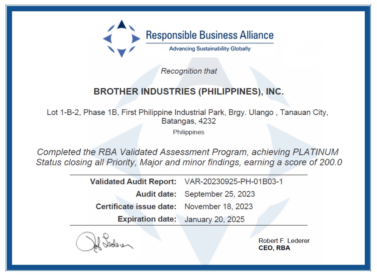 Situada na cidade de Batangas, a fábrica da Brother nas Filipinas dedica-se à produção de impressoras, equipamentos multifunções e sistemas de etiquetagem. Uma auditoria independente, certificada pela RBA, avaliou a unidade em várias categorias, incluindo trabalho, segurança, meio ambiente, ética e gestão da cadeia de distribuição, atribuindo-lhe um total de 200 pontos.