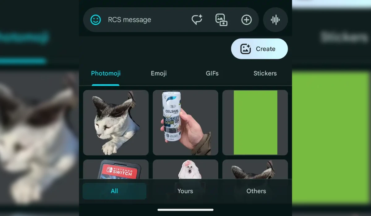 Para aceder ao Photomoji, procura o novo separador de Photomoji na seleção de emojis e expressões. Quando esta funcionalidade estiver ativa no teu dispositivo, notarás um distintivo circular sobre o botão de emojis. A partir daí, podes adicionar novos Photomojis, pressionando longamente num texto SMS ou chat RCS e escolhendo a opção “Criar” no final da barra de reações. Este botão também está disponível no seletor de emojis, permitindo-te criar Photomojis sem a necessidade de os enviar primeiro.