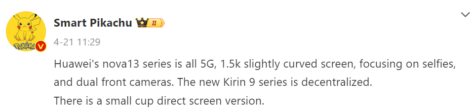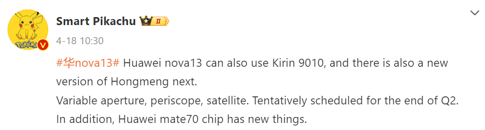 Os rumores não param por aqui. O conhecido leaker “Smart Pikachu” afirma que a série Nova 13 será lançada com o novo HarmonyOS Next. Os dispositivos devem também oferecer abertura variável para a câmara principal, uma lente telefoto periscópica e suporte para comunicação via satélite. A apresentação oficial poderá acontecer já no final do segundo trimestre deste ano.