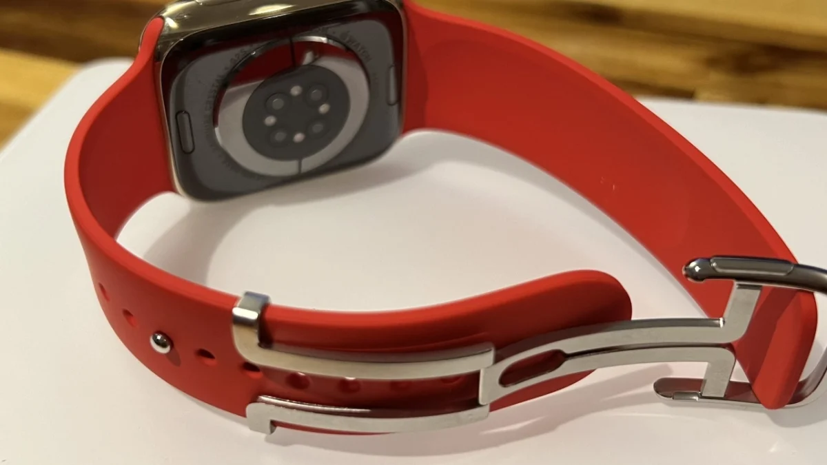O protótipo, que existe em vermelho e branco, apresenta um mecanismo de fecho com um clique satisfatório. A Apple também terá experimentado com braceletes de couro com o mesmo design, em tons de castanho, vermelho e ultravioleta.