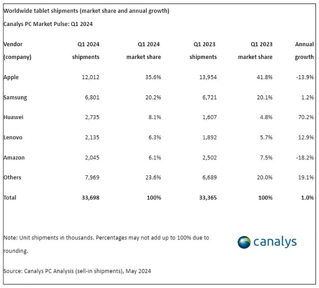 No geral, o mercado de tablets mostrou sinais de recuperação no primeiro trimestre de 2024. Foram enviados 33,7 milhões de equipamentos em todo o mundo, registando um ligeiro aumento de 1% em relação ao mesmo período do ano anterior.