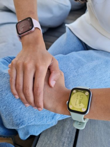 As diversas opções de pulseiras, facilmente intercambiáveis, em diferentes materiais e cores (Branco (pele),Cinzento,Branco,Verde,Cor-de-rosa,Preto) complementam as opções de personalização.