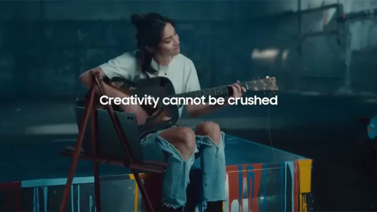 Em resposta ao anúncio da Apple, a Samsung lançou um comercial que celebra a criatividade e mostra o Galaxy Tab S9 Ultra como uma ferramenta que complementa, e não substitui, os instrumentos e ferramentas tradicionais. Num cenário semelhante ao do anúncio da Apple, vemos um músico a tocar uma guitarra parcialmente destruída, enquanto o tablet Samsung exibe notas musicais no ecrã. A mensagem é clara: a criatividade não pode ser esmagada.