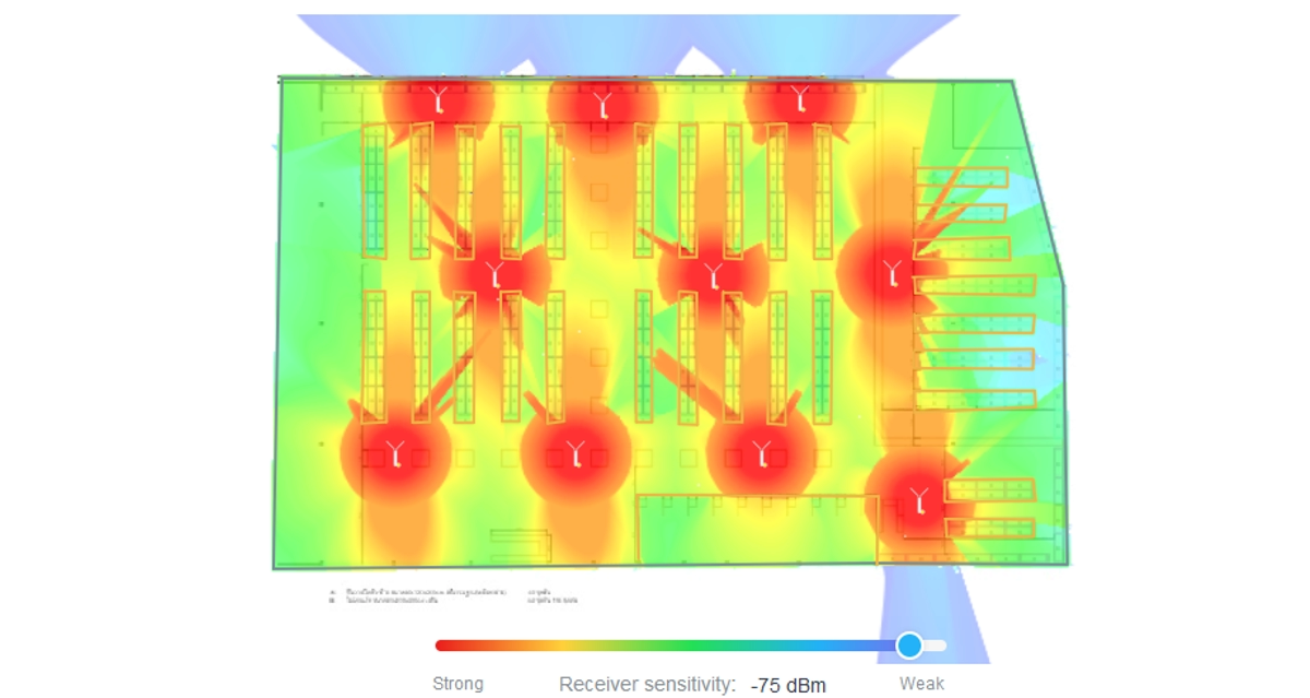 Na imagem abaixo, retrata um estudo de propagação de sinal Wireless onde se pode constatar a dispersão e contorno, tendo em conta os elementos físicos, os materiais de construção, posição e altura dos Pontos de Acesso.