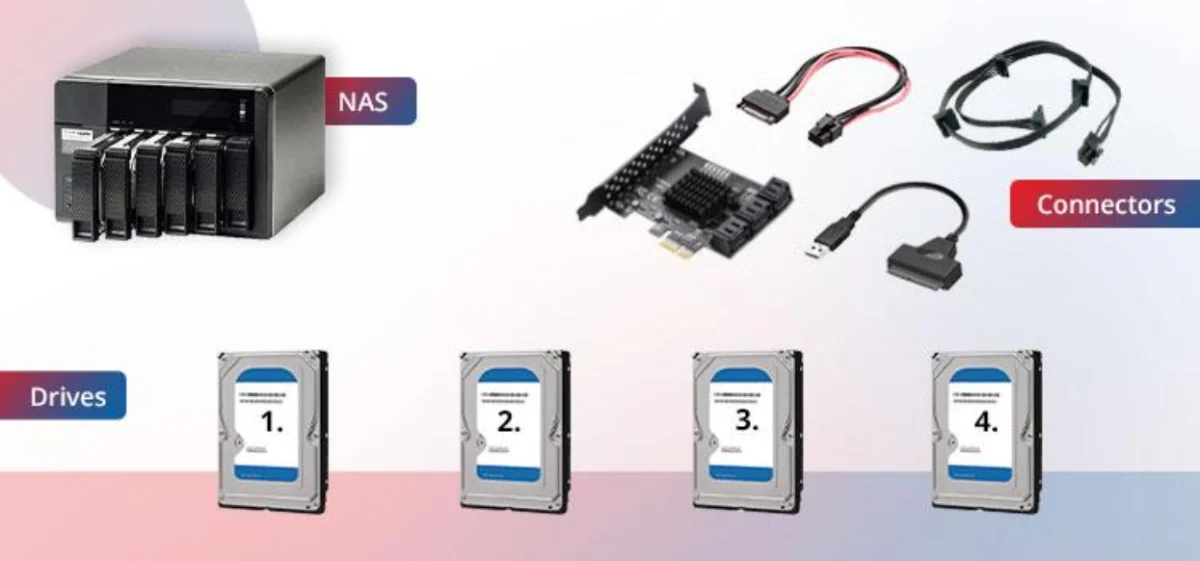 - Conecte as unidades Synology RAID clonadas ao sistema (usando o número exato em que estavam na caixa do NAS) usando um cabo SATA e um adaptador SATA para USB.