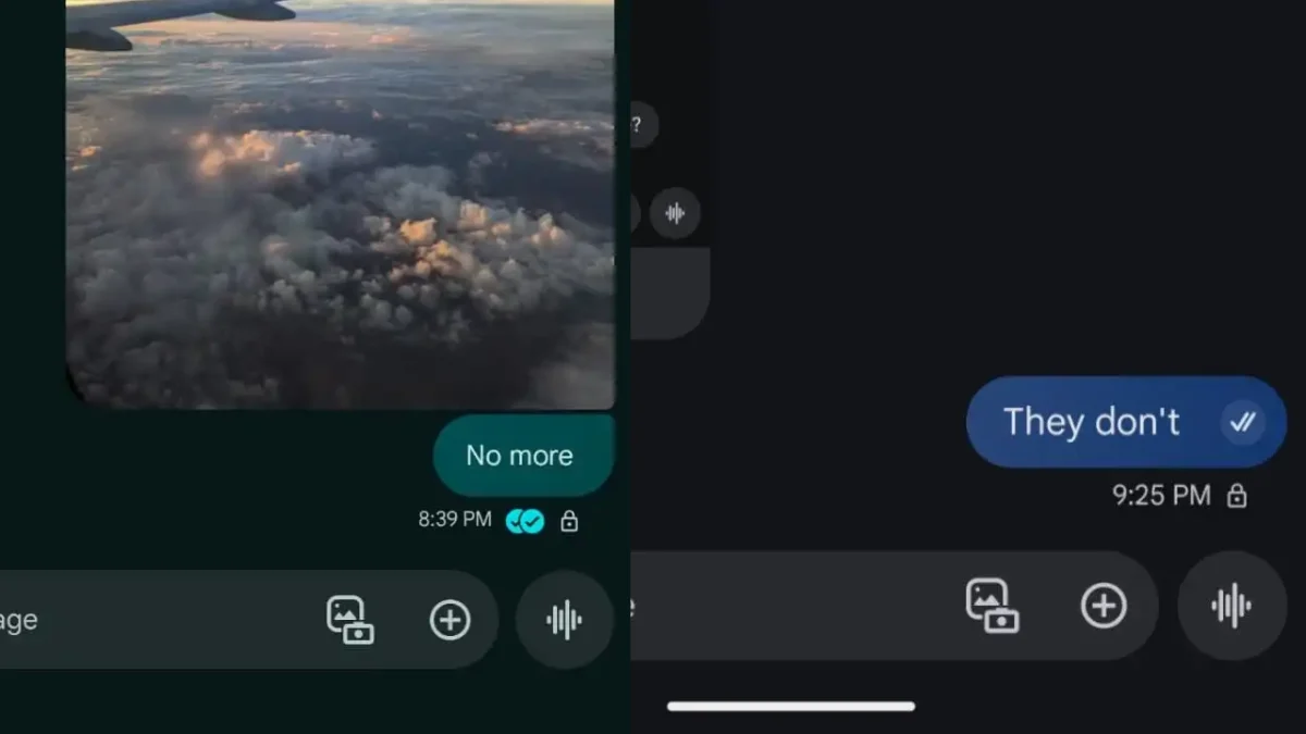 Esquece os antigos recibos de leitura debaixo das mensagens. A Google está a experimentar um design mais moderno e intuitivo. Agora, os ícones de leitura aparecem dentro das próprias bolhas de mensagem, no canto superior direito. Vais reparar num círculo ligeiramente mais claro que o fundo da mensagem, e é aí que a magia acontece. Se enviares uma imagem, os ícones ficam no canto inferior direito, para não te atrapalharem a ver a foto.