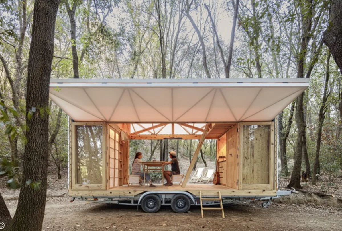 Além disso, as grandes janelas, desta casa móvel sustentável, permitem a entrada de luz natural e conectam os habitantes com o ambiente exterior.