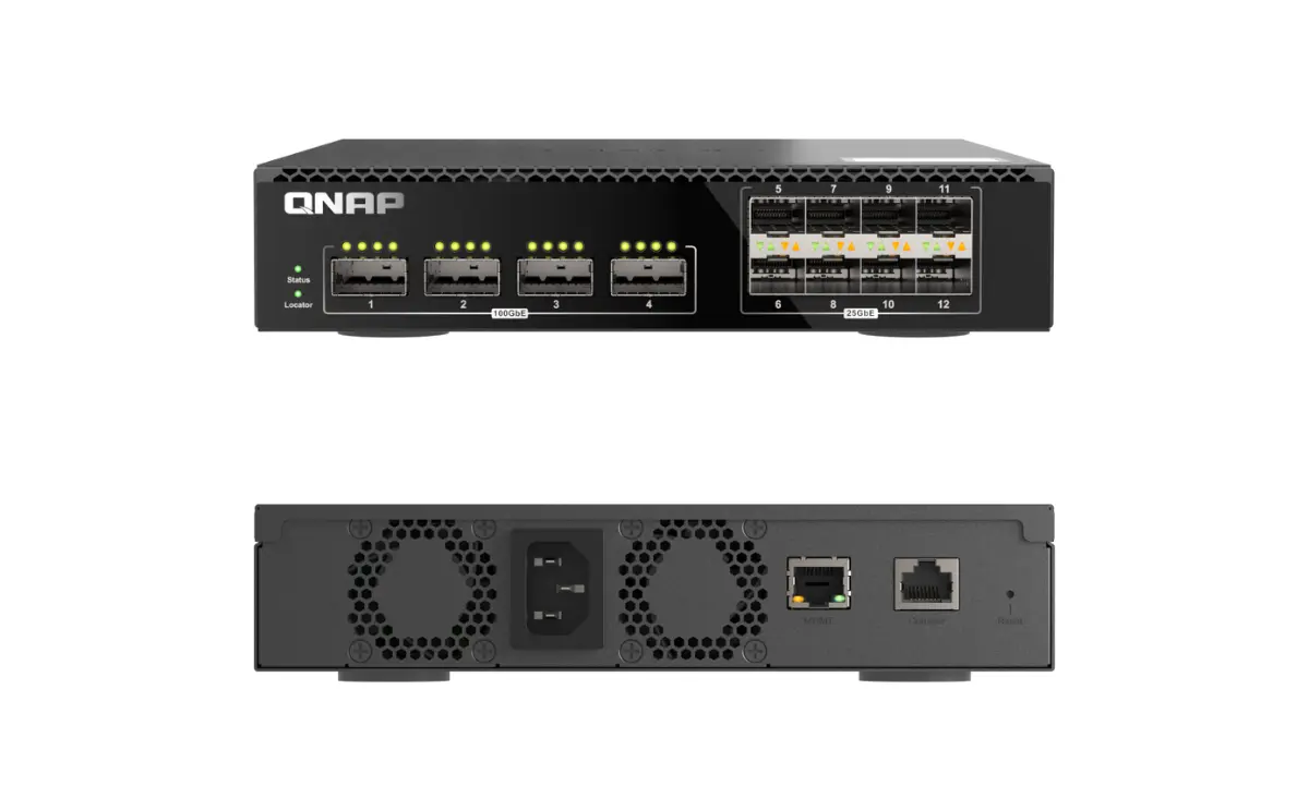 O QSW-M7308R-4X, com doze portas de rede (quatro portas de fibra QSFP28 100GbE e oito portas de fibra SFP28 25GbE, compatíveis com SFP+ 10GbE e SFP 1Gb), oferece essa escalabilidade e flexibilidade.
