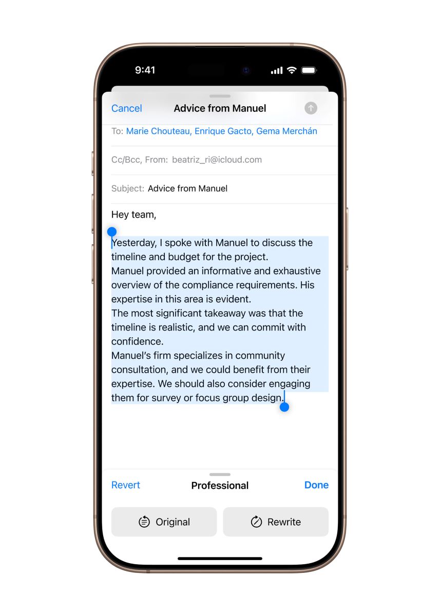 Com a Apple Intelligence, os utilizadores podem utilizar novas ferramentas de escrita, que lhes permitem reescrever, rever ou resumir textos de forma rápida e eficiente.