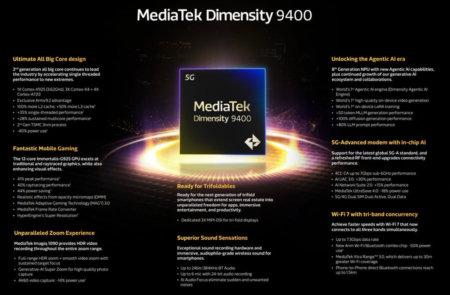 O Dimensity 9400 representa uma evolução notável em relação ao seu antecessor, o Dimensity 9300. A MediaTek apostou forte na arquitetura de núcleos grandes, integrando um poderoso núcleo Arm Cortex-X925 a funcionar a mais de 3,62 GHz, acompanhado por três núcleos Cortex-X4 e quatro núcleos Cortex-A720. Esta configuração resulta num aumento de 35% no desempenho de núcleo único e 28% no desempenho multi-núcleo em comparação com o modelo anterior.