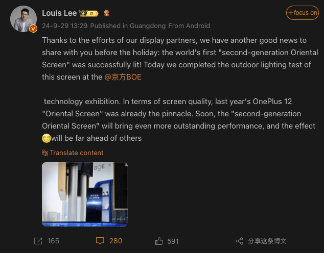 Li Jie Louis afirma que o ecrã BOE X2 irá superar o BOE X1 presente no OnePlus 12 em vários aspetos. Numa publicação anterior, o executivo tinha já mencionado que este novo ecrã teria “alto brilho” e uma melhor “experiência de proteção ocular”.
