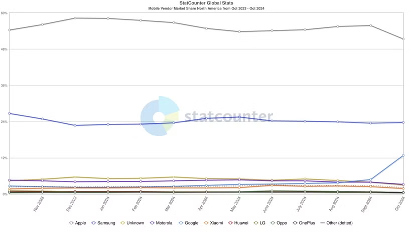 A Google está a celebrar um momento histórico com o seu mais recente topo de gama, o Pixel 9. Segundo dados revelados pela StatCounter, a empresa conseguiu um feito notável ao triplicar a sua presença no mercado norte-americano, passando de 4,76% para 12,9% em apenas um mês. Este crescimento exponencial permitiu à tecnológica ultrapassar marcas estabelecidas como a Motorola e a OnePlus.
