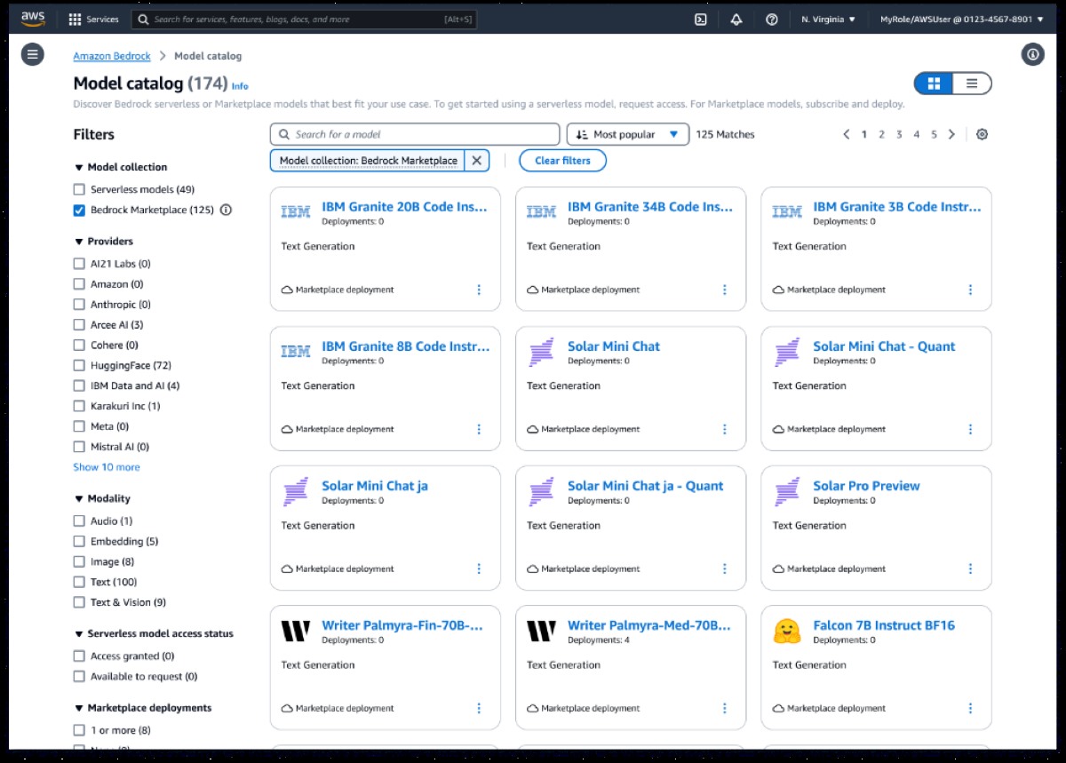 A introdução do Amazon Bedrock Marketplace facilita o acesso a uma seleção diversificada de modelos emergentes e especializados. Este marketplace disponibiliza mais de 100 modelos direcionados a casos de uso específicos, como análise financeira, tradução avançada ou geração de proteínas. Exemplos incluem o modelo Palmyra-Fin, otimizado para o setor financeiro, e o modelo ESM3, da EvolutionaryScale, direcionado para a biologia molecular.