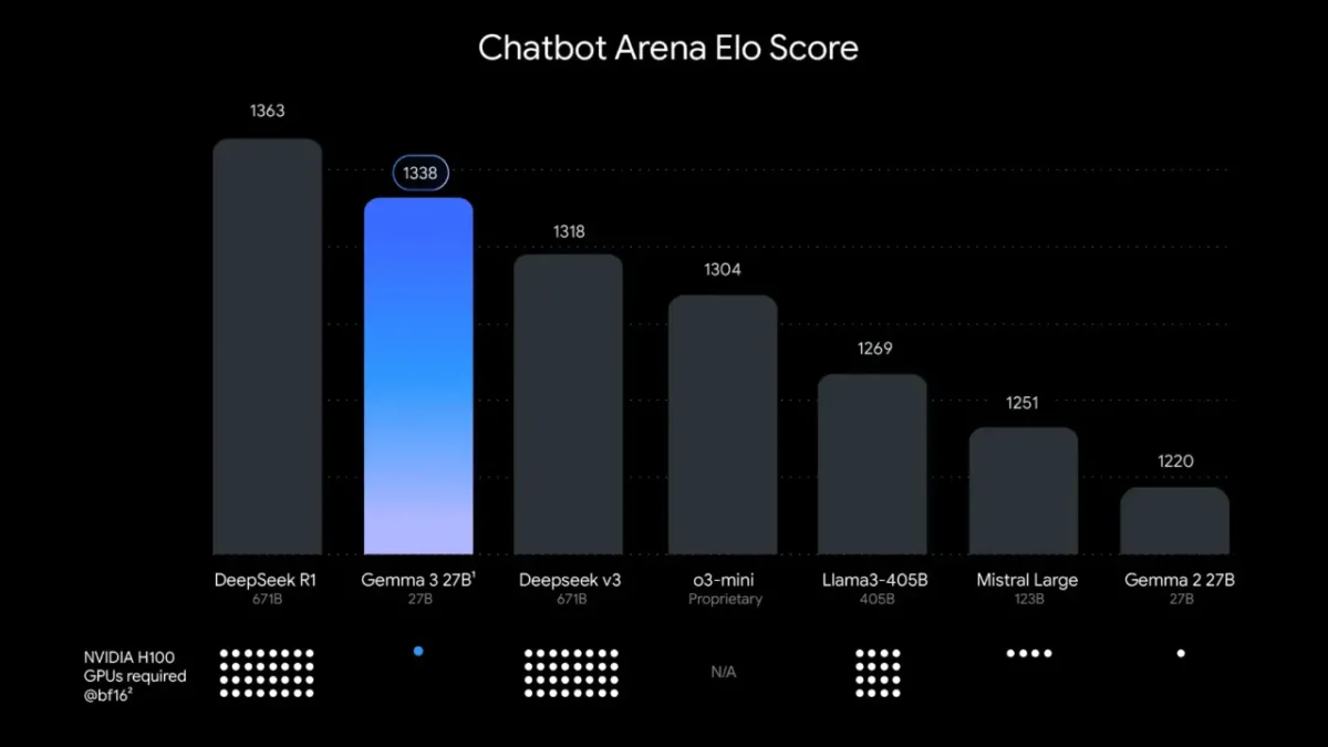 Em benchmarks divulgados, o Gemma 3 27B supera modelos como o Mistral Large e Meta Llama-405B em:
