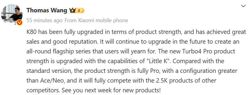 Segundo Wang Teng, o desempenho do Turbo 4 Pro superará até modelos rivais das séries Ace e Neo, que até agora se destacavam neste segmento.