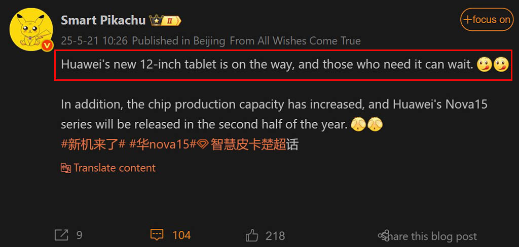 Ainda recentemente, a Huawei surpreendeu o mercado global com o lançamento do MatePad Pro 12.2, um tablet com especificações de topo. Embora se esperasse que este fosse revelado na China juntamente com a série Nova 14, a empresa optou por um evento mais contido, limitando os dispositivos apresentados. Contudo, segundo informações partilhadas pelo conhecido leaker SmartPikachu, a Huawei tem mais alguns trunfos na manga no que toca a tablets, incluindo este modelo de 12 polegadas, que deverá ser lançado em breve no mercado chinês.