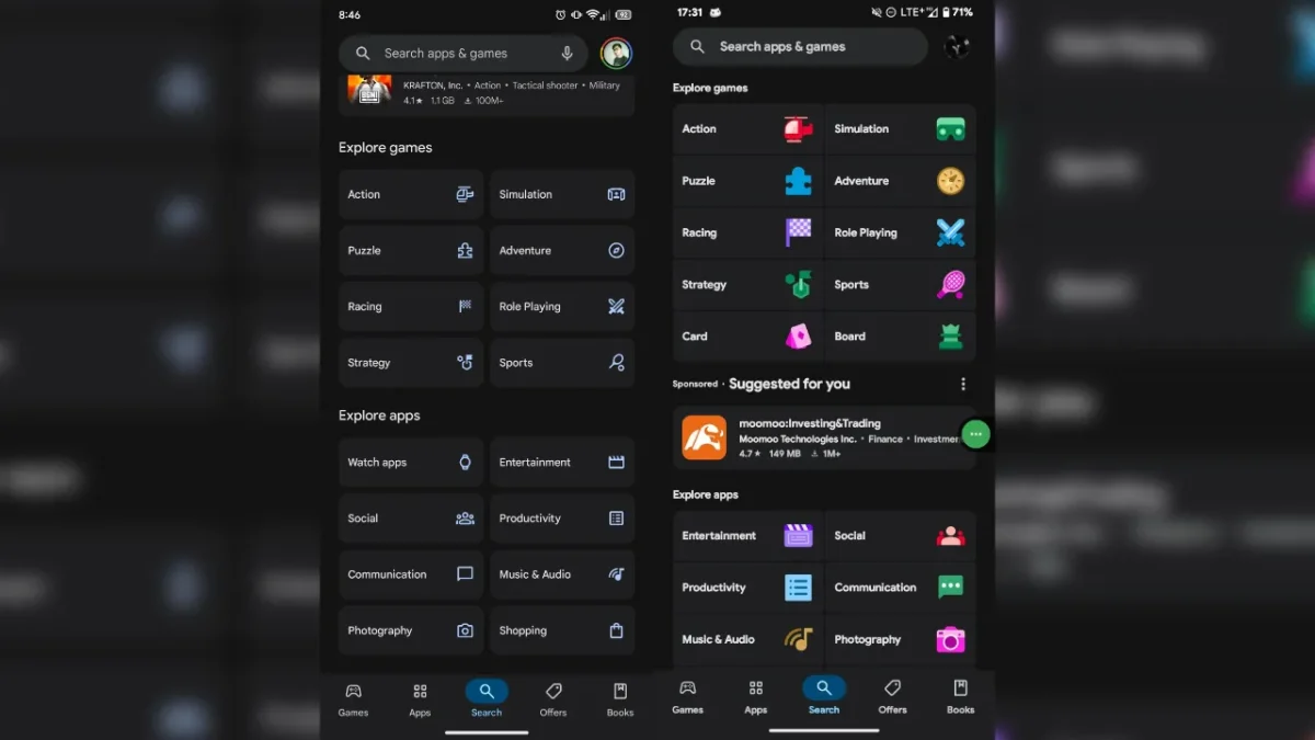 Até agora, quando utilizavas a função de pesquisa na Play Store, os atalhos para categorias como “Jogos”, “Livros” ou “Filmes” eram representados por ícones de linha, todos eles pintados num tom de azul minimalista. Embora funcionais, podiam ser difíceis de distinguir rapidamente. A nova atualização vem resolver precisamente isso.