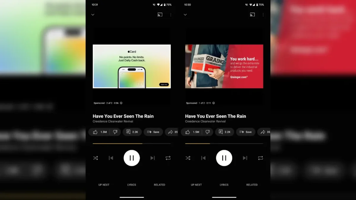 Atualmente, a experiência gratuita já inclui publicidade, mas de uma forma menos intrusiva no ecrã principal. Quando um anúncio sonoro começa, a capa do álbum é substituída por uma imagem retangular com a indicação “Patrocinado”, e a barra de progresso muda para a cor amarela, desativando temporariamente os controlos de avançar e recuar. A novidade é a sobreposição de um novo tipo de anúncio à interface de reprodução normal.