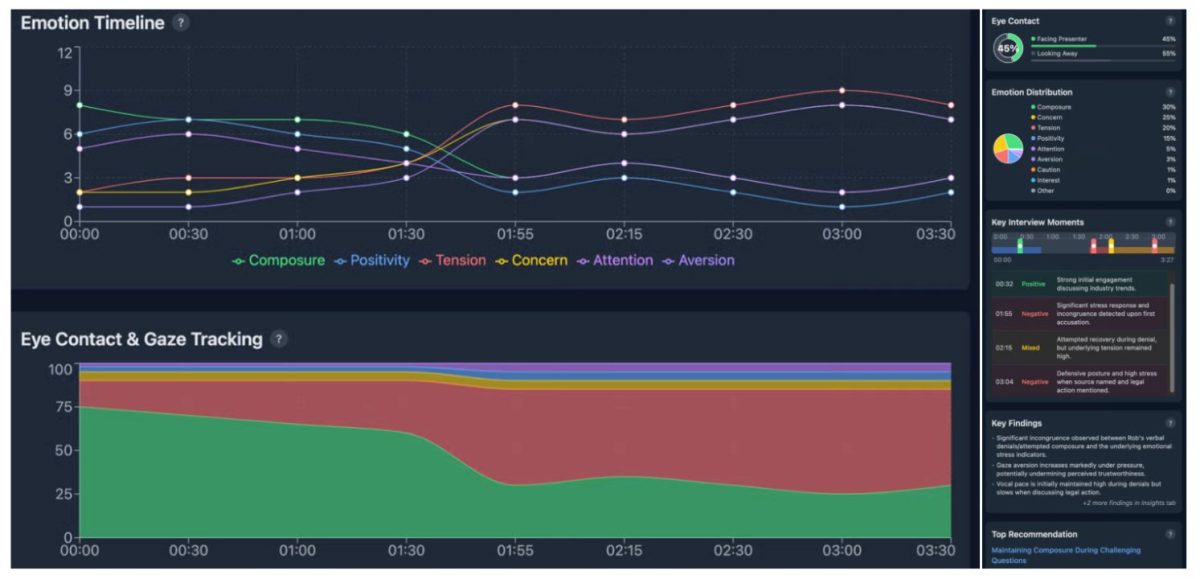 A ferramenta de análise biométrica monitoriza o contacto visual e a direção do olhar dos porta-vozes. Analisa também o discurso em termos de conteúdo, ritmo, volume e clareza, bem como as reações e expressões faciais, hesitações e apoios linguísticos. Em poucos minutos, identifica e analisa momentos do discurso e realiza uma modelação emocional com base em parâmetros como compostura, preocupação, tensão e interesse.