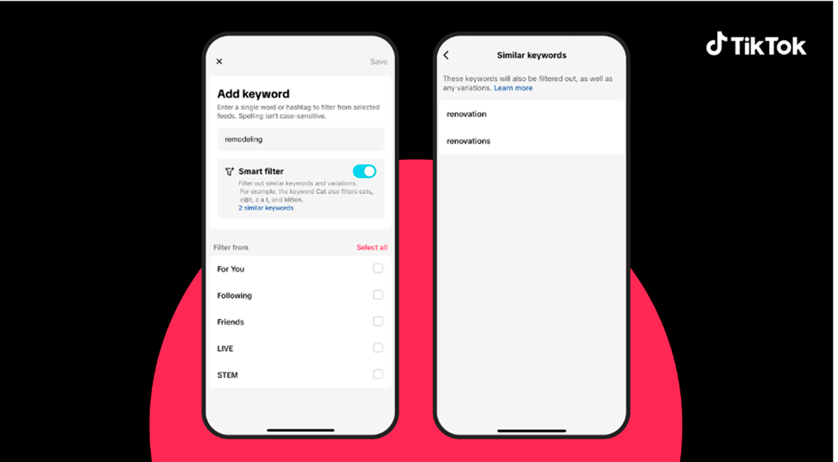O TikTok introduziu também um sistema de “Filtros Inteligentes por Palavras-chave”. A ferramenta, baseada em IA, expande a funcionalidade existente ao bloquear não apenas os termos exatos inseridos pelo utilizador, mas também palavras e sinónimos semelhantes. A empresa anunciou ainda que o limite de palavras-chave que podem ser filtradas será duplicado para 200.