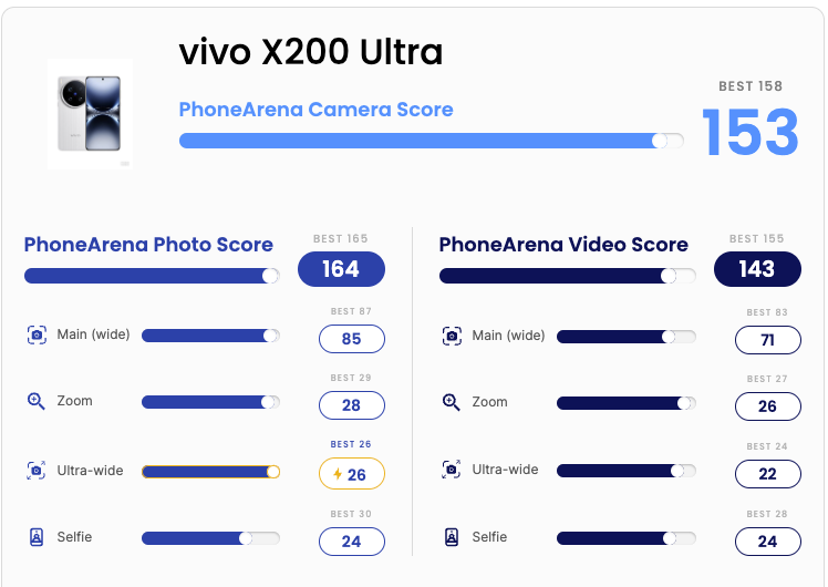 Em termos de pontuação, o Vivo X200 Ultra alcança uns respeitáveis 164 pontos em fotografia, muito próximo dos 165 pontos do Xiaomi 15 Ultra e do Galaxy S25 Ultra, e à frente dos 160 pontos do Oppo Find X8 Ultra. No entanto, a sua pontuação em vídeo (143 pontos) fica aquém dos seus concorrentes (Xiaomi e Samsung com 150, Oppo com 155). Isto reflete-se na pontuação geral de câmara, onde o Vivo X200 Ultra (153) é ligeiramente superado pelo Xiaomi 15 Ultra (158), Oppo Find X8 Ultra (157) e Samsung Galaxy S25 Ultra (158), principalmente devido ao desempenho da câmara frontal e às capacidades de gravação de vídeo.