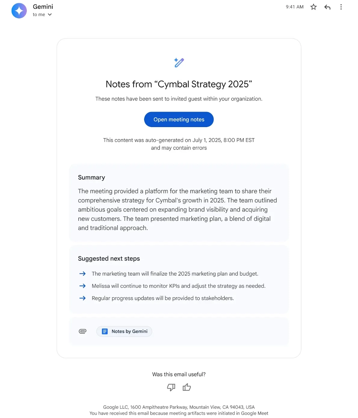 Acabou-se o passo intermédio de ter de abrir um documento à parte. Agora, o próprio email que recebes após a reunião já inclui os pontos mais importantes: um sumário do que foi discutido e uma lista de “próximos passos sugeridos”. Isto significa que, na prática, consegues ter uma visão geral da chamada e saber quem ficou responsável por cada tarefa sem sequer saíres da tua aplicação de email. A eficiência e a rapidez com que acedes à informação foram claramente melhoradas.