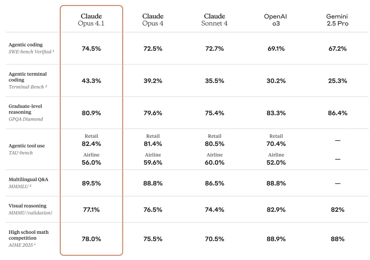Em métricas de referência reconhecidas no setor, o Opus 4.1 mostrou-se mais competente do que o seu antecessor. Os resultados falam por si: