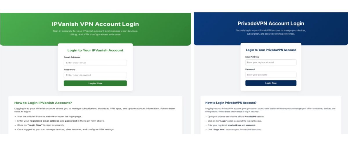 Os investigadores identificaram portais de phishing que replicam quase na totalidade as páginas de início de sessão de serviços populares como o IPVanish e o PrivadoVPN. O uso de kits de phishing permite que os atacantes produzam estas falsificações com um esforço mínimo, enganando utilizadores que acabam por entregar as suas credenciais voluntariamente. Esta tática é eficaz contra jovens que, ao acreditarem estar a reforçar a sua segurança, estão na verdade a facultar o acesso às suas contas pessoais e bancárias.