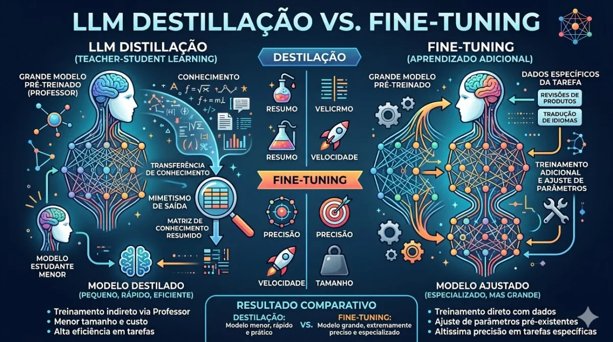 Quando uma empresa decide adaptar um modelo de inteligência artificial às suas necessidades, depara-se com duas opções técnicas, a destilação de LLM e o fine-tuning (ajuste fino), mais conhecido pelo termo inglês fine-tuning. As duas técnicas são frequentemente apresentadas como alternativas, mas têm objetivos distintos, custos muito diferentes e casos de uso que raramente se sobrepõem. Perceber a diferença entre elas permite evitar desperdício de recursos e garantir o desempenho esperado em produção. Para quem ainda não está familiarizado com o conceito de destilação, recomendamos a leitura do artigo Destilação de modelos de IA: o que é e como funciona.