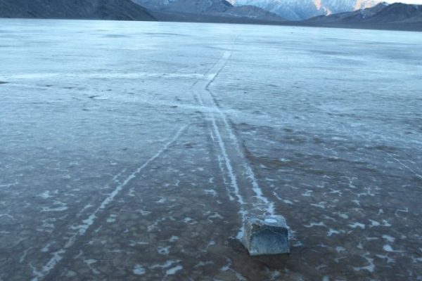GPS: Pedra equipada com um aparelho de localização se move na superfície árida do lago Racetrack Playa, no Vale da ...