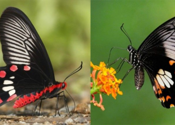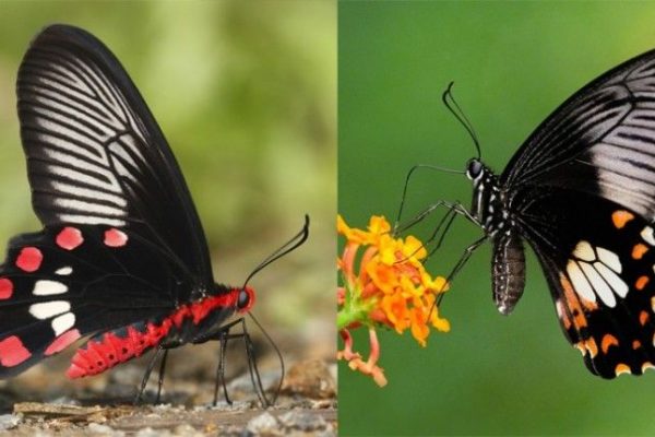 A borboleta mórmon comum (Papilio polytes, à direita) imita os padrões de asa da borboleta rosa comum (à esquerda). Crédito: ...