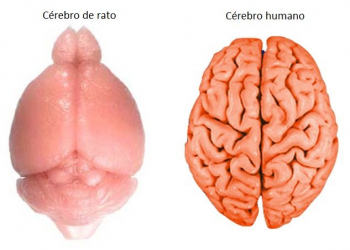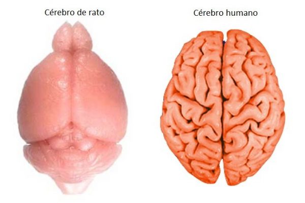 O liso e relativamente pequeno cérebro de um rato em comparação com o rugoso e grande cérebro humano. Crédito: Elizabeth ...