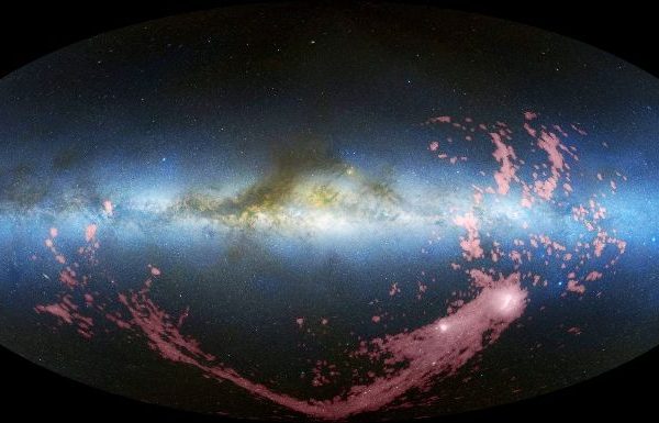 A Corrente Magalhânica (colorida artificialmente de rosa na imagem acima) origina-se nas Nuvens de Magalhães (manchas brancas na porção inferior ...