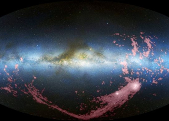 A Corrente Magalhânica (colorida artificialmente de rosa na imagem acima) origina-se nas Nuvens de Magalhães (manchas brancas na porção inferior ...