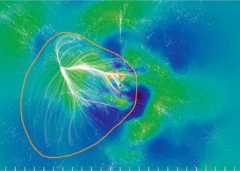 Mapa de superaglomerados de galáxias que se estende por 1,5 bilhão (mil milhões) de anos-luz. O círculo amarelo limita o ...
