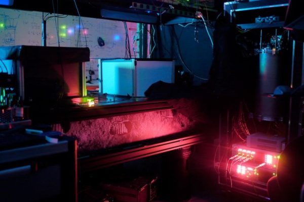 Laboratório da Universidade de Waterloo onde se obteve o entrelaçamento quântico de 3 fótons. Crédito: K. Shalm; NIST No estranho ...