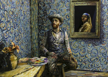 As fotos de uma instalação que junta o auto-retrato de Van Gogh e o quadro rapariga do brinco de pérola, de ...